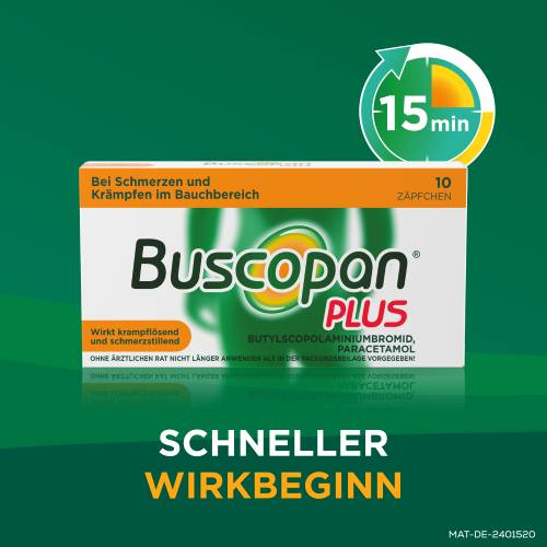 Buscopan® plus, Filmtabletten, Zäpfchen. Wirkstoffe: Butylscopolaminiumbromid, Paracetamol. Anwendungsgebiet: Für Erwachsene und Jugendliche ab 12 Jahren bei krampfartigen Schmerzen bei Erkrankungen des Magens und des Darmes, krampfartigen Schmerzen und Funktionsstörungen im Bereich der Gallenwege, der ableitenden Harnwege sowie der weiblichen Geschlechtsorgane (z. B. schmerzhafte Regelblutungen). Hinweis: Packungsbeilage beachten. Apothekenpflichtig.