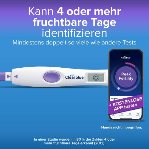 • Eindeutige Ergebnisse – An Ihren fruchtbaren Tagen erscheint der einzigartige lächelnde Clearblue Smiley: Wenn Sie an Tagen mit hoher oder maximaler Fruchtbarkeit Geschlechtsverkehr haben, erhöhen Sie Ihre Chancen, schwanger zu werden, auf ein Maximum