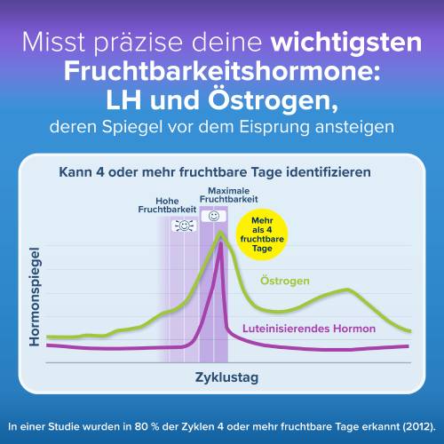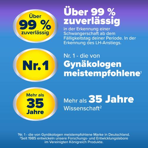 • Der einzige Test, der 4 oder mehr fruchtbare Tage identifizieren kann und so Ihre Chancen erhöht, schwanger zu werden – um mindestens das 2-Fache ggü. anderen Ovulationstests (2)