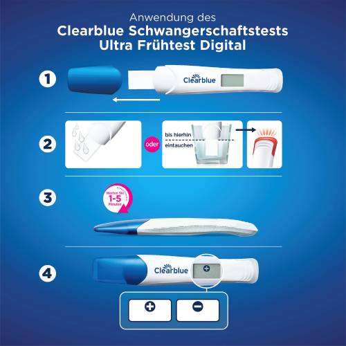 Der Clearblue Schwangerschaftstest Ultra Frühtest Digital kombiniert eine ultrasensitive Früherkennung des Schwangerschaftshormons hCG mit eindeutigen digitalen Ergebnissen. Das Testen wird durch eine besonders breite Testspitze und durch das einzigartige Stopp-Licht vereinfacht, das blinkt, wenn ausreichend Urin von der Testspitze aufgenommen wurde. Unsere Floodguard(TM)-Technologie erleichtert zusätzlich das korrekte Testen. Nach der Probenahme wird der Smart Countdown(TM) auf dem Display angezeigt, um zu bestätigen, dass der Test auswertet, und um die Zeit bis zu Ihrem eindeutigen digitalen Ergebnis anzuzeigen, das innerhalb von 1–5 Minuten erscheint.