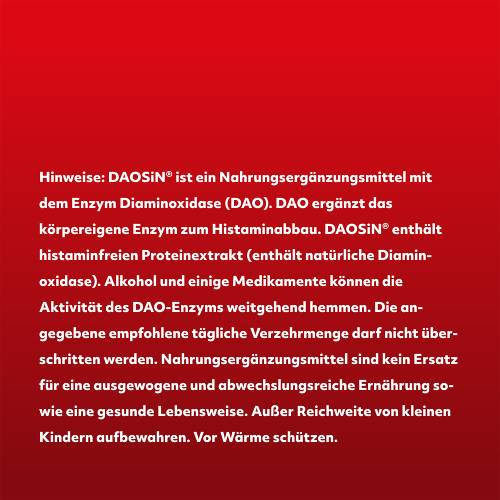 Nehmen Sie DAOSiN® unbedingt - im Idealfall ca. 15 Minuten - vor einer Mahlzeit mit etwas Wasser ein. Wenn die histaminhaltigen Lebensmittel den Darm erreichen, sollte die Tablette bereits aufgelöst und die enthaltene DAO aktiv sein. Die maximale Tagesverzehrmenge beträgt 3 Tabletten. Dies entspricht 3 histaminhaltigen Mahlzeiten pro Tag.