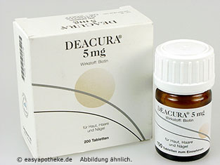Die Deacura 5 mg Tabletten werden zum Ausgleich eines Biotin-Mangel und zur Kräftigung von Haaren und Nägeln angewendet.  Die Tabletten enthalten den Wirkstoff Biotin, welcher zur Gruppe der B Vitamine gehört. Das Biotin erfüllt eine wichtige Rolle im Stoffwechselgeschehen. Der Wirkstoff ist unter anderem am Auf- und Abbau von Kohlenhydraten, Fettsäuren und Aminosäuren beteiligt. Durch einen Biotin-Mangel kann es unter anderem zu Hauterkrankungen, Haarausfall, Appetitverlust, Müdigkeit und Muskelschmerzen kommen. Gründe für einen Biotin-Mangel können zum Beispiel Mangelernährung oder eine Störung der Darmflora sein. Die Einnahme der Deacura 5 mg Tabletten wird bei chronischen Darmerkrankungen, übermäßigem Alkoholkonsum und Störungen der Darmflora empfohlen.