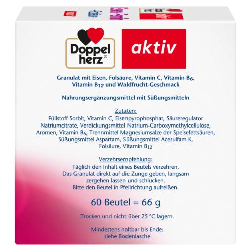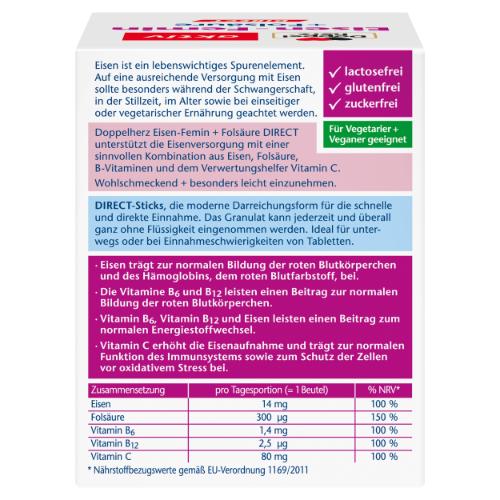 Eisen ist ein lebenswichtiges Spurenelement. Auf eine ausreichende Versorgung mit Eisen sollte besonders während der Schwangerschaft, in der Stillzeit, im Alter sowie bei einseitiger oder vegetarischer Ernährung geachtet werden. Doppelherz Eisen-Femin + Folsäure DIRECT unterstützt die Eisenversorgung mit einer sinnvollen Kombination aus Eisen, Folsäure, B-Vitaminen und dem Verwertungshelfer Vitamin C. Die wohlschmeckenden Micro-Pellets bieten dabei eine moderne Darreichungsform für die schnelle und direkte Einnahme. Die feinen Granulatperlen können jederzeit und überall ganz ohne Flüssigkeit eingenommen werden. Ideal für unterwegs oder bei Einnahmeschwierigkeiten von Tabletten. Eisen trägt zur normalen Bildung der roten Blutkörperchen und des Hämoglobins, dem roten Blutfarbstoff, bei. Die Vitamine B6 und B12 leisten einen Beitrag zur normalen Bildung der roten Blutkörperchen. Vitamin B6, Vitamin B12 und Eisen leisten einen Beitrag zum normalen Energiestoffwechsel. Vitamin C erhöht die Eisenaufnahme und trägt zur normalen Funktion des Immunsystems esowie zum Schutz der Zellen vor oxidativem Stress bei.
