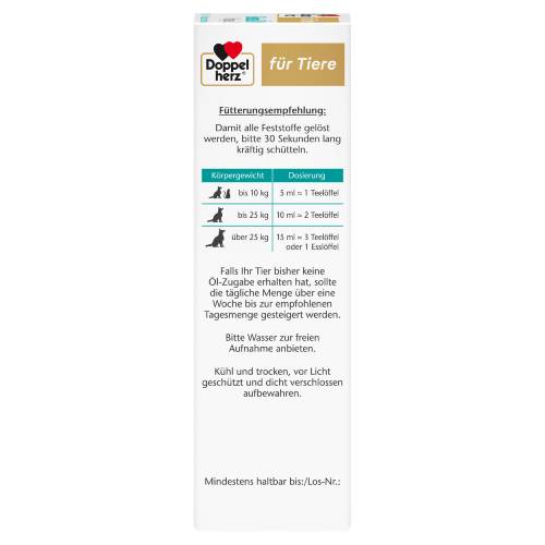 Je nach Gewicht des Tieres werden 1 bis 3 Teelöffel täglich gegeben. Das schmackhafte Öl eignet sich perfekt zum Untermischen im Futter.