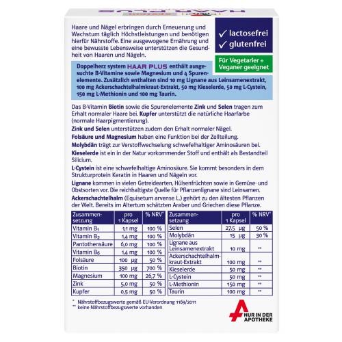 Doppelherz system enthält eine Kombination ausgesuchter B-Vitamine sowie Magnesium und die Spurenelemente Zink, Kupfer, Selen und Molybdän. Das B-Vitamin Biotin sowie die Spurenelemente Zink und Selen tragen zum Erhalt normaler Haare bei. Für den Erhalt der natürlichen Haarfarbe (natürliche Haarpigmentierung) spielt das Spurenelement Kupfer eine Rolle. Zink und Selen tragen zum Erhalt normaler Nägel bei. Folsäure und Magnesium haben eine Funktion bei der Zellteilung. Vitamin B1, Vitamin B2 und Pantothensäure leisten einen Beitrag zum normalen Energiestoffwechsel. Vitamin B6 wird für die Bildung der Aminosäure Cystein benötigt und unterstützt die normale Regulierung der Hormontätigkeit. Das Spurenelement Molybdän trägt zur Verstoffwechselung schwefelhaltiger Aminosäuren bei. Die Kapsel enthält zusätzlich 10 mg Lignane aus Leinsamenextrakt, 100 mg Ackerschachtelhalmkraut-Extrakt, 50 mg Kieselerde,
