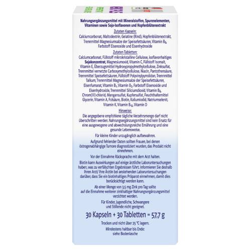 Doppelherz system MENO PLUS enthält Nährstoffe für die Frau in den Wechseljahren in einer Kombination aus Tablette und Kapsel: Vitamin B6 zur Regulierung der normalen Hormontätigkeit, Pantothensäure für Energie und geistige Leistungsfähigkeit sowie Vitamin D für den Knochenerhalt. Für das Wohlbefinden in den Wechseljahren spielen verschiedene Faktoren, unter anderem auch eine gesunde Lebensführung sowie eine gesunde Ernährung, eine wichtige Rolle. In den Wechseljahren beginnt sich die körpereigene Hormonproduktion der Frau zu verändern. Bei vielen Frauen kommt es im Rahmen dieser natürlich bedingten Veränderungen im Stoffwechsel zu Begleiterscheinungen, wie lästigen Hitzewallungen und gelegentlichen Schweißausbrüchen. Eine ausreichende Versorgung mit Vitaminen und Spurenelementen trägt zum Wohlbefinden bei. Vitamin B6 trägt zur Regulierung der Hormontätigkeit bei und zur normalen Funktion des Nervensystems. Pantothensäure trägt zum normalen Energiestoffwechsel und zu einer normalen geistigen Leistungsfähigkeit bei. Vitamin D als Beitrag für den Erhalt normaler Knochen. Magnesium trägt zum Elektrolytgleichgewicht bei. Biotin und Zink tragen zum Erhalt normaler Haut + Haare bei. Zink leistet einen Beitrag zur normalen Funktion des Immunsystems. Folsäure hat eine Funktion bei der Zellteilung und unterstützt die normale Blutbildung. Vitamin E trägt dazu bei, die Zellen vor oxidativem Stress zu schützen. Eisen trägt zur normalen Bildung der roten Blutkörperchen bei und unterstützt den normalen Sauerstofftransport im Körper. Jod trägt zur normalen Produktion der Schilddrüsenhormone und zur normalen Schilddrüsenfunktion bei.