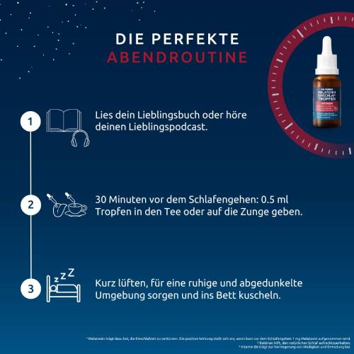 Verzehrsempfehlung: Um die Einschlafzeit zu verkürzen ca. 30 Minuten vor dem Schlafengehen 0,5 ml der Tropfen (siehe Markierung auf der Pipette) direkt in den Mund geben. Diese Menge entspricht 1,8 mg Melatonin. Flasche vor Entnahme schütteln.