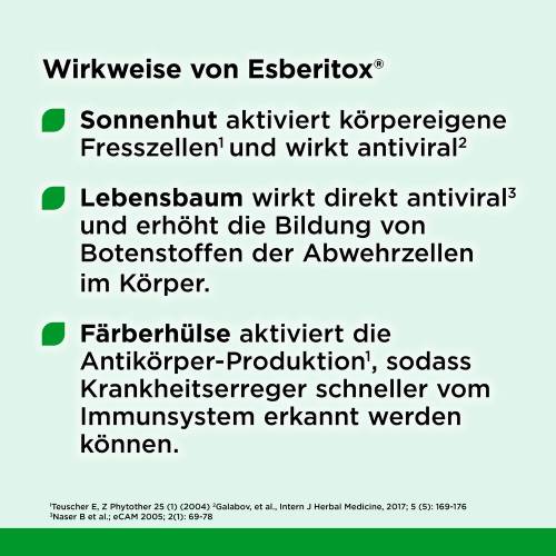 Bei ersten Schluckbeschwerden, erstem Halsweh, beginnender Schnupfnase oder Druck auf den Bronchien eingenommen wirkt Esberitox am effektivsten. Gemeinsam bekämpfen Färberhülse, Sonnenhut und Lebensbaum die Erkältung aus verschiedenen Richtungen; unter anderem werden die Viren direkt bekämpft, das Immunsystem gestärkt und gleichzeitig werden Keim vernichtende Fresszellen aktiviert.