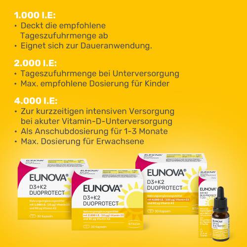 Die Kombination der sich ergänzenden Vitamine D3 und Vitamin K2 in einem Präparat ist im Hinblick auf die Ernährungsphysiologie sinnvoll. EUNOVA® DuoProtect leistet als 2-in-1-Nahrungsergänzungsmittel eine wertvolle Ergänzung zu einer gesunden Ernährung und bewussten Lebensweise.