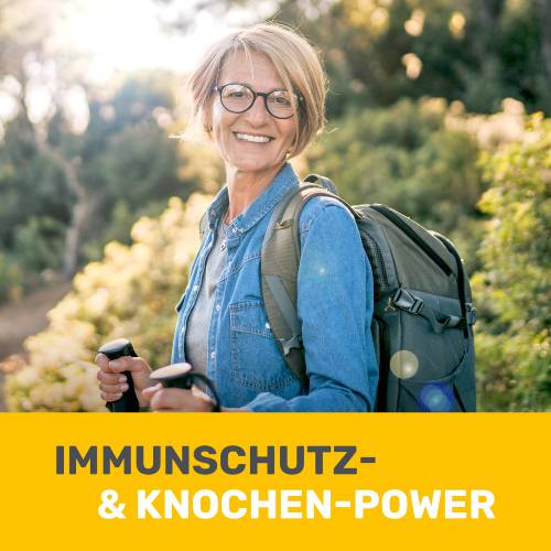 Doch der überwiegende Abbau von Knochenmasse ist nicht nur ein Problem älterer Frauen. Auch Männer sind betroffen. Es lohnt sich für beide Geschlechter, einem sich häufig schleichend entwickelnden Knochenschwund vorzubeugen. Um die Knochen zu unterstützen und optimal zu versorgen, ist insbesondere Vitamin D wichtig. Vitamin D fördert die Aufnahme und Verwertung von Calcium und sorgt so für eine gute Calciumversorgung des Knochens.