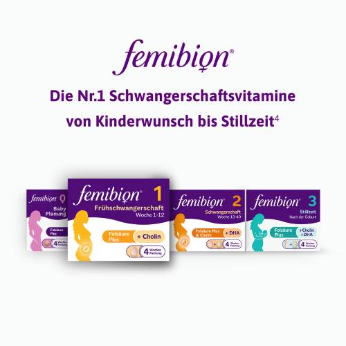 ⁶Femibion® ist die einzige Marke in Deutschland mit Folsäure Plus (eine Kombination aus Folsäure und Metafolin®) und Cholin.