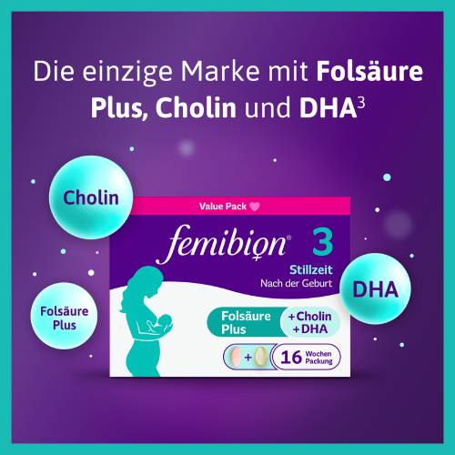 - INHALT: 1x Femibion® 3 tägliches Nahrungsergänzungsmittel für die Stillzeit, mit DHA, Folsäure & Metafolin®, 4-Wochen-Packung inkl. 28x Tabletten (ca. 15,2 mm) & 28x Kapseln (ca. 21,3 mm)