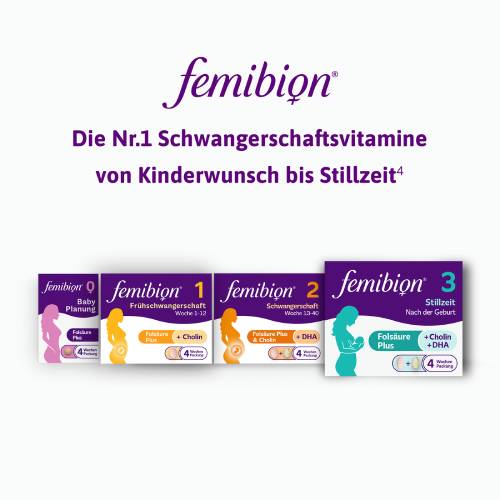 ³Femibion® ist die einzige Marke in Deutschland mit Folsäure Plus (eine Kombination aus Folsäure und Metafolin®) und Cholin.