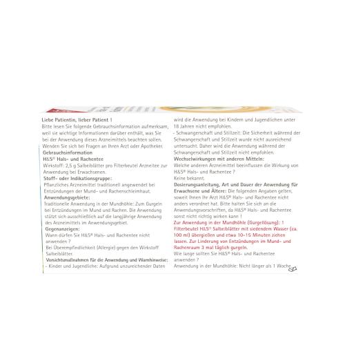 Für die Anwendung im Mund-Rachen-Bereich 1 Filter-beutel für 1 Glas/Tasse (ca. 100 ml). Mit kochendem Wasser über gießen und 10-15 Minuten ziehen lassen. Filterbeutel herausnehmen und schwach ausdrücken. Mit dem frisch zubereiteten und abgekühlten Teeaufguß spülen oder gurgeln. Bei akuten Beschwerden, die länger als eine Woche andauern oder periodisch wiederkehren, wird die Rücksprache mit einem Arzt empfohlen.