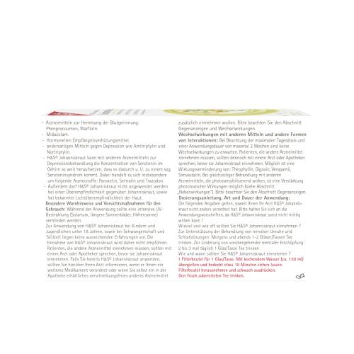 Bei gleichzeitiger Anwendung von H&S-Johanniskraut kann die Wirksamkeit von blutgerinnungshemmenden Mitteln vom Cumarin-Typ (Phenprocoumon, Warfarin), Digoxin, Theophyllin und einigen Antidepressiva abgeschwächt sein. Patienten, die H&S-Johanniskraut und gleichzeitig Arzneimittel mit einem dieser Wirkstoffe einnehmen, sollten den Rat ihres behandelnden Arztes einholen (s. auch Abschnitt 'Wechselwirkungen').