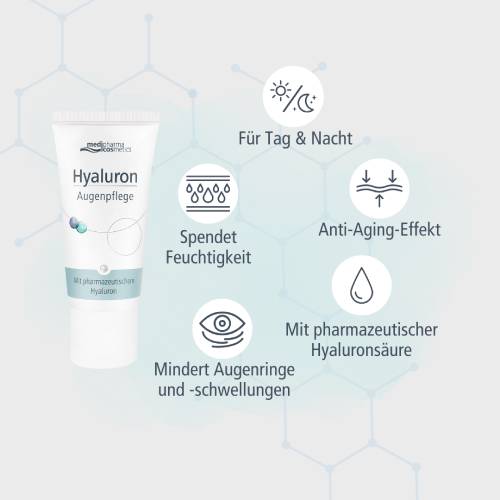 Ein weiterer Grund, der für eine Gesichtspflege speziell für die Augenpartie spricht, ist unsere Mimik: Blinzeln, Lachen, Weinen und Sprechen hinterlassen hier eindeutige Spuren. Zusätzlich wirken sich Stress und Umwelteinflüsse negativ auf diesen Bereich aus – die Haut neigt zu Schwellungen, Schatten und Faltenbildung. Gerade im Alter wird diese empfindliche Region in Ihrem Gesicht noch dünner. Hier kommt die Hyaluron Augenpflege von medipharma cosmetics ins Spiel. Durch die enthaltene Hyaluronsäure versorgt sie Ihre Haut intensiv mit Feuchtigkeit und kann dabei glättend auf Fältchen wirken. Zusätzlich können Augenringe minimiert und Schwellungen entgegengewirkt werden.