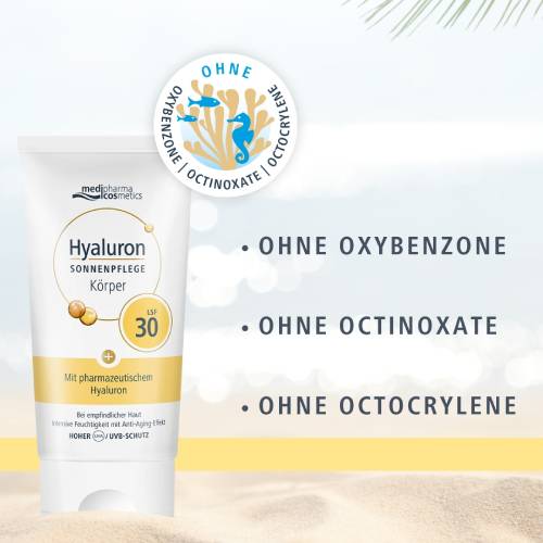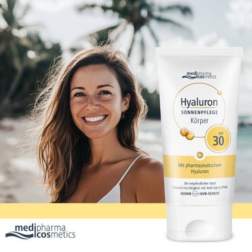 Die Hyaluron Sonnenpflege Körper LSF 30 von medipharma cosmetics bietet empfindlicher und trockener Haut zuverlässigen Schutz und intensive Feuchtigkeitspflege bei starker Sonneneinstrahlung.