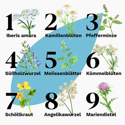 Jede der 9 in Iberogast® Classic verwendeten Heilpflanzen bringt ihre individuellen Fähigkeiten mit, die positiv auf verschiedene Bereiche im Magen-Darm-Trakt einwirken. Doch erst im Zusammenspiel miteinander entfalten die konzentrierten Pflanzenextrakte ihre bewährte Wirkung. Die in Iberogast® Classic enthaltenen Heilpflanzen sind: