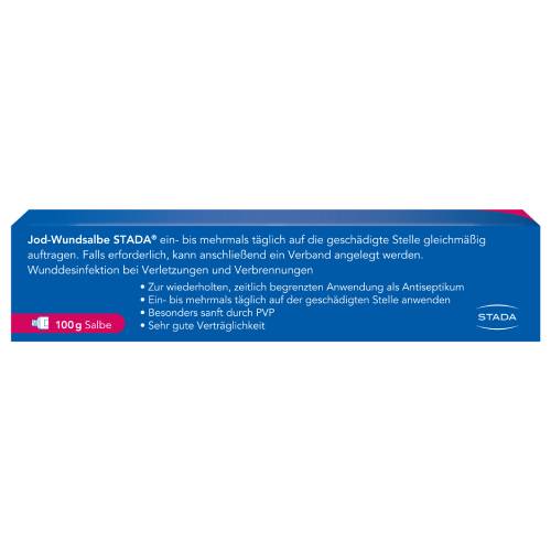 Jod-Wundsalbe STADA® 100 mg/g Salbe Wirkstoff: Povidon-Iod. Zur wiederholten zeitlich begrenzten Anwendung: als Antiseptikum bei geschädigter Haut, z. B. bei Dekubitus (Druckgeschwür), Ulcus cruris (Unterschenkelgeschwür), oberflächlichen Wunden und Verbrennungen, infizierten und superinfizierten Hauterkrankungen.