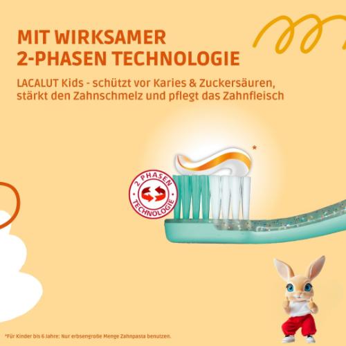 Die Lacalut Kids Zahncreme wurde speziell für Kinder im Alter von 2 bis 6 Jahren entwickelt und bietet eine schonende Zahnpflege ab dem ersten Milchzahn. Mit einem altersgerechten Fluoridgehalt von 1000 ppm schützt sie vor Karies und den schädlichen Auswirkungen von Zuckersäuren – genau wie vom Deutschen Nationalen Verband für Zahn-, Mund- und Gesichtschirurgie empfohlen. Die 2-Phasen-Technologie sorgt in der orangen Phase für einen wirksamen Karies- und Zuckersäurenschutz, während die weiße Phase den Zahnschmelz stärkt und das Zahnfleisch schützt.