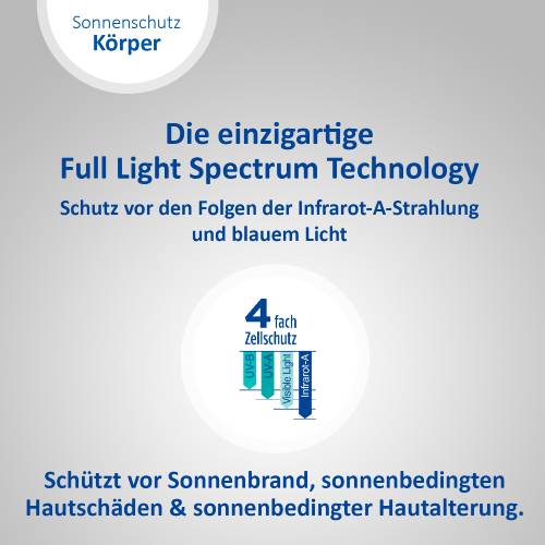 Sonnenstrahlen gibt es in verschiedenen Wellenlängen. Sie haben verschiedene Auswirkungen auf die Haut, wirken jedoch alle zellschädigend. Daher ist es wichtig einen Sonnenschutz zu verwenden, der rundum schützt. Dank einzigartigem 4-fach Zellschutz schützt die Ladival® Trockene Haut Sonnenschutz-Lotion vor UV-A- und UV-B-Strahlen, vor den Folgen der Infrarot-A-Strahlung und sichtbarem Licht (einschließlich blauem Licht). So wird die Haut auch vor einer vorzeitigen, sonnenbedingten Hautalterung geschützt.
