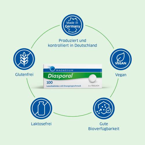 Die Magnesium Diasporal 150 Kapseln werden zur ausreichenden Versorgung des Körpers mit Magnesium angewendet. Die Kapseln enthalten Magnesiumcitrat. Magnesium ist ein Kofaktor von mehr als 300 Enzymen. Ohne ausreichend Magnesium würden alle energieabhängigen Vorgänge nicht funktionieren. Zusätzlich sorgt der Mineralstoff für eine reibungslose Funktion des Muskelapparates. Die Magnesium Diasporal 150 Kapseln liefern das notwenige Magnesium um die Zellwände zu stabilisieren und die Freisetzung von Hormonen und Botenstoffen zu unterstützen.