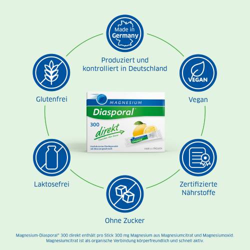 Das Magnesium Diasporal 300 direkt Granulat wird zur Linderung der typischen Symptome eines Magnesiummangels angewendet. Das Granulat enthält als wirksamen Inhaltsstoff reines Magnesium. Bei einem Magnesiummangel kommt es häufig zu Wadenkrämpfen, Muskelverspannungen, Muskelzuckungen, Migräne und Verstopfungen. Zu einem Magnesiummangel kann es unter anderem bei Sportlern durch übermäßiges Schwitzen, bei Schwangeren und bei Menschen mit einer unzureichenden Aufnahme von Magnesium mit der Nahrung. Das Magnesium Diasporal 300 direkt Granulat versorgt den Körper mit der empfohlenen Menge Magnesium.