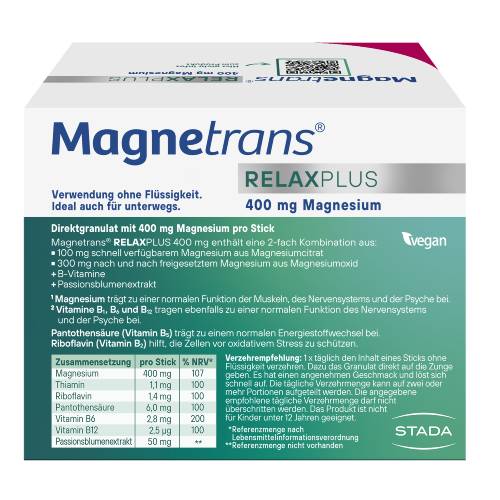 Ergänzt wird diese Wirkung durch die einzigartige Kombination aus 5 B-Vitaminen, die das Nervensystem unterstützen³, ⁴, und Passionsblumenextrakt, der traditionell zur Beruhigung bei innerer Unruhe und Anspannung eingesetzt wird. Diese harmonische Synergie bietet mit Magnetrans® RelaxPlus dein Plus an Entspannung.1,2,3,4
