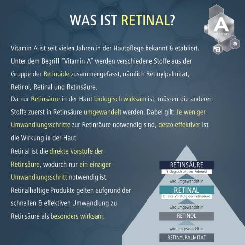 Da nur Retinsäure in der Haut biologisch wirksam ist, müssen die anderen Stoffe zuerst in Retinsäure umgewandelt werden. Dabei gilt: Je weniger Umwandlungsschritte zur Retinsäure notwendig sind, desto effektiver ist die Wirkung in der Haut. Retinal ist die direkte Vorstufe der Retinsäure, wodurch nur ein einziger Umwandlungsschritt notwendig ist. Retinalhaltige Produkte gelten aufgrund der schnellen & effektiven Umwandlung zu Retinsäure als besonders wirksam und dienen in der Kosmetik insbesondere zur Verbesserung der Hautstruktur, sowie zur Minderung Faltentiefe. Ergänzt wird das Serum durch einen Hyaluronsäure-Komplex aus kurz-, langkettigen und quervernetzten Molekülen, sowie Glycerin zur intensiven Feuchtigkeitsversorgung.
