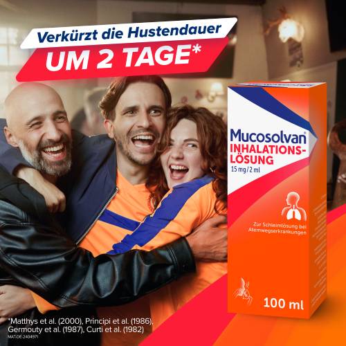 Mucosolvan® Inhalationslösung 15 mg/2 ml. Wirkstoff: Ambroxolhydrochlorid. Anwendungsgebiet: Zur Schleim lösenden Behandlung bei akuten und chronischen Erkrankungen der Bronchien und der Lunge mit zähem Schleim.