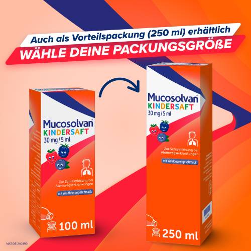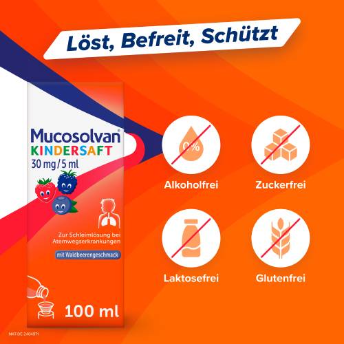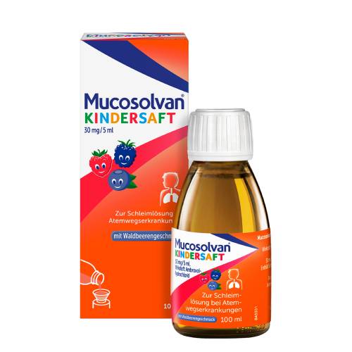 Mucosolvan® Kindersaft 30 mg/5ml. Wirkstoff: Ambroxolhydrochlorid. Anwendungsgebiet: Zur Schleim lösenden Behandlung bei akuten und chronischen Erkrankungen der Bronchien und der Lunge mit zähem Schleim. Warnhinweis: Enthält Sorbitol, Benzoesäure und Propylenglycol. Apothekenpflichtig.