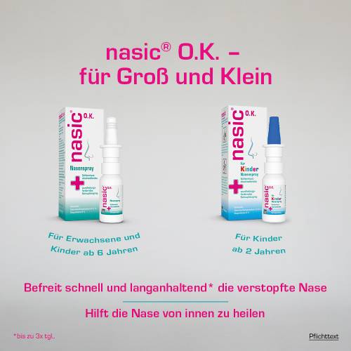 Bei Kindern im Alter zwischen 2 und 6 Jahren wird nach Bedarf bis zu 3-mal täglich je ein Sprühstoß nasic® für Kinder O.K. in jede Nasenöffnung eingebracht – den Sprühkopf möglichst senkrecht einführen und je einmal pumpen.
