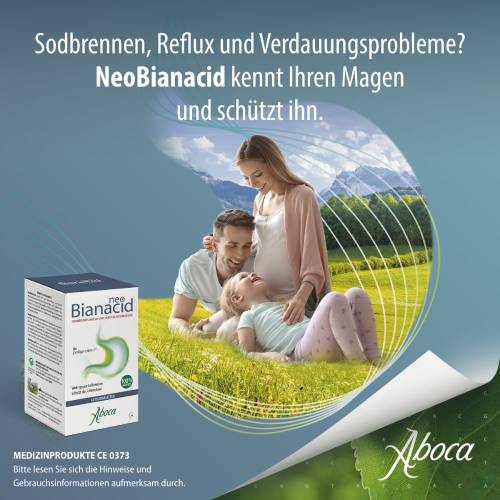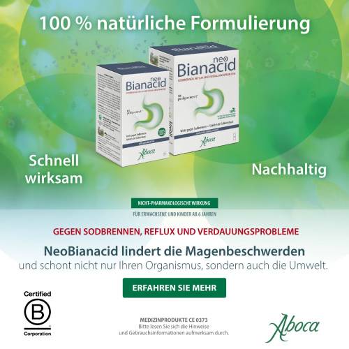 NeoBianacid Übersäuerung und Reflux ist ein Produkt auf Basis pflanzlicher und mineralischer Molekülkomplexe, das schützend und deshalb schmerzlindernd auf die Schleimhaut des Magens und der Speiseröhre wirkt und somit den typischen Symptomen gereizter und entzündeter Schleimhaut wie Sodbrennen, Schmerzen und Säuregefühl rasch entgegenwirkt. NeoBianacid Übersäuerung und Reflux kann prophylaktisch in Situationen eingesetzt werden, die Schleimhautreizungen verursachen können (Einnahme nichtsteroidaler entzündungshemmender Arzneimittel/Schmerzmittel, bei psychisch-körperlichem Stress, Jahreszeitenwechsel, ungesunder Ernährung und Lebensweise).