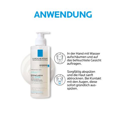 Die EFFACLAR H ISO-BIOME Reinigungscreme von La Roche Posay auf das angefeuchtete Gesicht auftragen und gleichmäßig verteilen. Nach dem Aufschäumen das Gesicht gründlich unter klarem Wasser abspülen und anschließend die Haut mit einem weichen Handtuch trocken tupfen. Bei Kontakt mit den Augen diese sofort sorgfältig ausspülen. Im Anschluss empfiehlt sich die Verwendung der EFFACLAR H ISO-BIOME Feuchtigkeitspflege, um die Hautpflegeroutine optimal zu unterstützen.