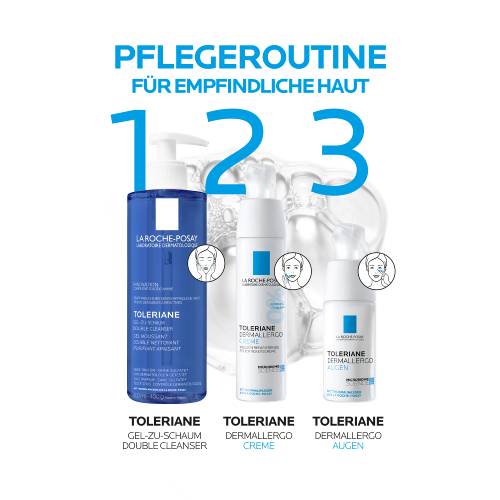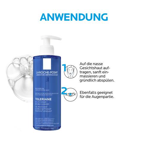 Anwendungshinweis: Für die tägliche Gesichtsreinigung den TOLERIANE Gel-zu-Schaum Double Cleanser morgens und abends auf die nasse Haut im Gesicht und rund um die Augenpartie auftragen. Den Gesichtsreiniger sanft einmassieren und anschließend gründlich abspülen. Nachfolgend empfiehlt sich die Anwendung einer Gesichtspflege – wie z. B. die TOLERIANE Dermallergo Gesichtscreme.