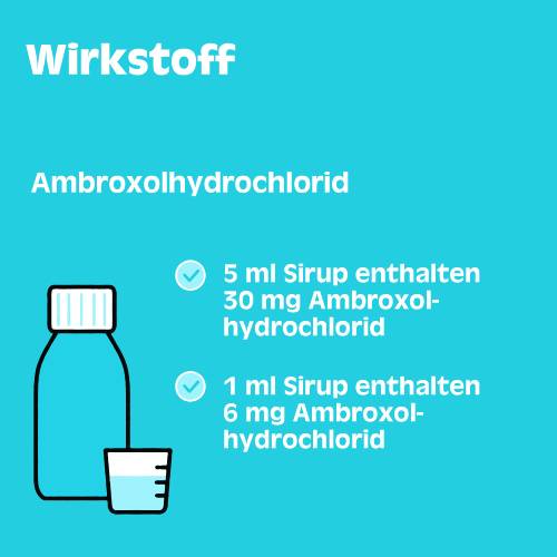 Der bewährte Wirkstoff Ambroxol verringert die Viskosität des festsitzenden Schleims und verbessert den Selbstreinigungsmechanismus der Bronchien. Dadurch wird das Abhusten erleichtert und erneute Hustenattacken reduziert.