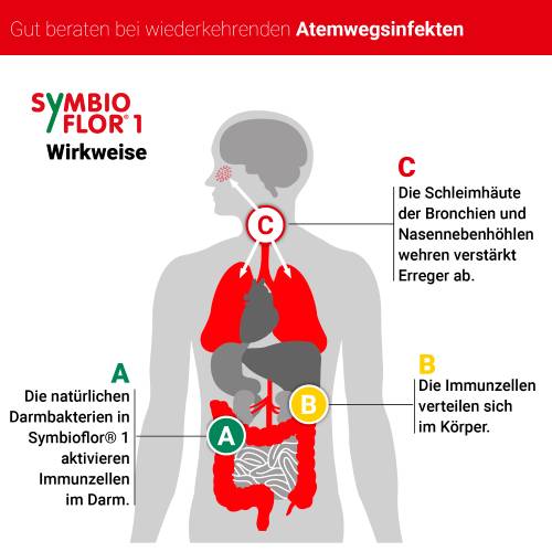 Die in Symbioflor® 1 enthaltenen natürlichen Darmbakterien, nämlich Enterococcus faecalis, aktivieren Immunzellen im Darm, dem größten menschlichen „Immunorgan“, wo die Mehrzahl der Abwehrzellen angesiedelt ist. Nach ihrer Aktivierung wandern diese Immunzellen durch den Blutkreislauf und erreichen verschiedene Teile des Körpers, einschließlich der Atemwege. Dort angekommen, tragen sie zur Stärkung der Abwehr an den Schleimhäuten der Bronchien und Nasennebenhöhlen bei. Dies führt zur Verringerung der Rückfallrate von wiederkehrenden Atemwegserkrankungen wie z.B. Bronchitis und Sinusitis. Der ganzheitliche Ansatz zeigt, dass der Darm einen wesentlichen Bestandteil für ein gesundes Immunsystem darstellt und z.B. den Ansatzpunkt für die Prävention von wiederkehrenden Atemwegserkrankungen bildet. Symbioflor® 1 ist frei von Konservierungsstoffen, Aromen und Alkohol und bietet eine exakte Dosierbarkeit.
