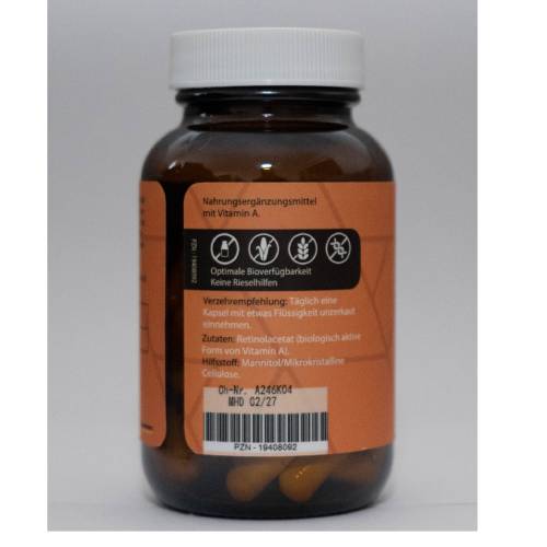 In diesem Produkt wird Vitamin A in einer bioaktiven Form eingesetzt, die vom Körper direkt aufgenommen und verwertet werden kann. Dadurch wird eine effiziente Versorgung mit dem wichtigen Mikronährstoff sichergestellt.