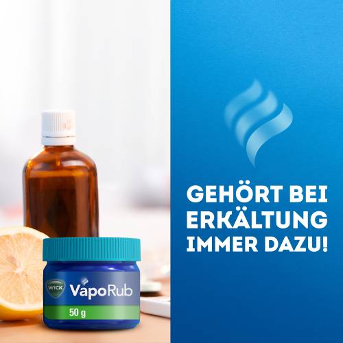 Egal, was Sie bei leichten oder stärkeren Erkältungen tun, WICK VapoRub Erkältungssalbe gehört bei Erkältung immer dazu! Das Erkältungsmittel lindert Symptome eines grippalen Infekts effektiv. Es ist wirksam bei Husten, Schnupfen, Heiserkeit und Verschleimung. Mit der WICK Vaporub Erkältungssalbe kann die ganze Familie wieder besser durchatmen.