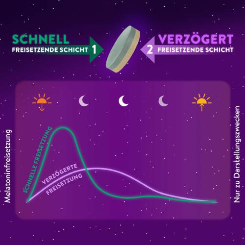 • ZWEI-SCHICHT-TABLETTE HILFT, SCHNELLER EINZUSCHLAFEN¹ & DURCHZUSCHLAFEN². Eine Schicht mit schneller Freisetzung von Melatonin für schnelleres Einschlafen¹, eine Schicht mit verzögerter Freisetzung von Melatonin über 8 Std., die beim Durchschlafen² hilft